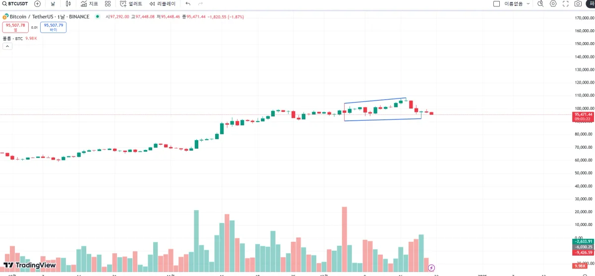 고점과 저점이 계속 상승하는 상승 추세 였지만, 4일 전부터 고점이 낮아지는 하락 추세로 전환 된거 같습니다.