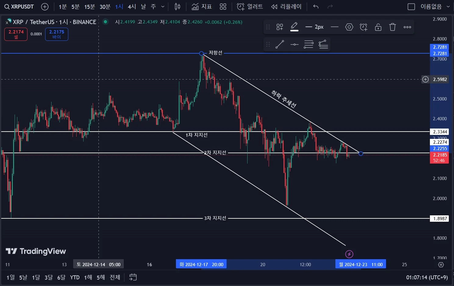 횡보 후 상승 포지션에서 저항선 맞고 60분봉 하락 추세선 작도해 보았습니다. 1차, 2차 지지선을 올바르게 작도 했는지 모르겠네요. 이후 횡보하거나 하락하는 모습을 보일 거 같습니다.