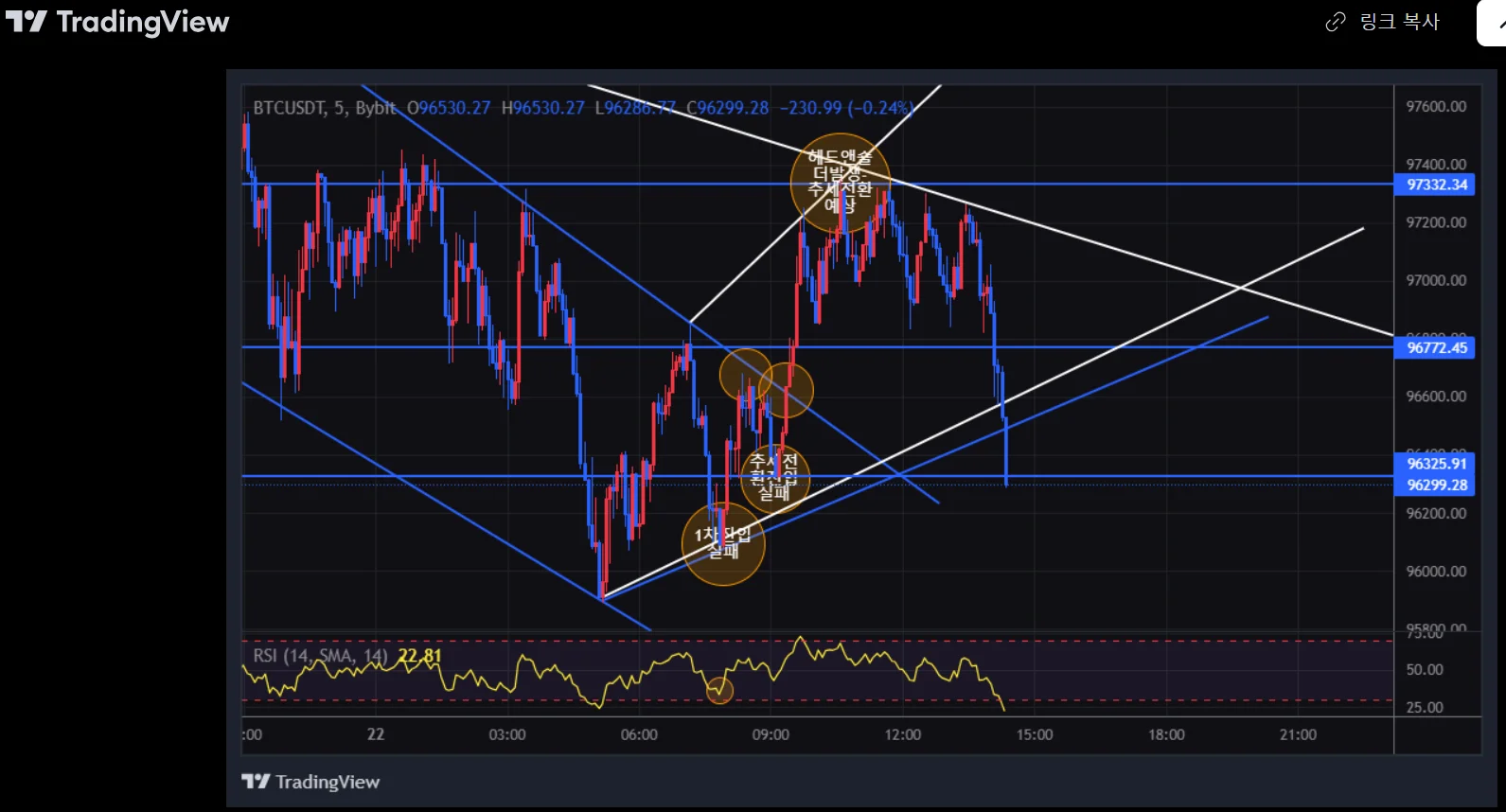 1차 진입 시도 구간 - 하락추세에서 상승추세로 전환 중 과매도 구간에 근접, 상단의 노란색 추세선에서 익절 예상)