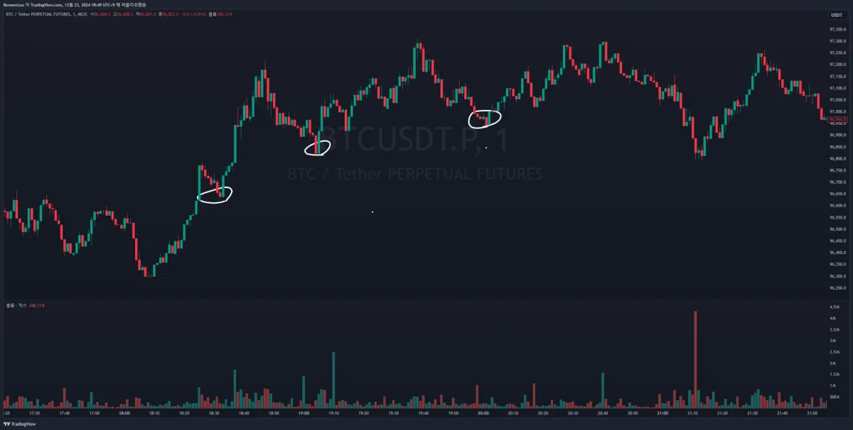 차트가 단기간 상승하여 분봉캔들이 다 그려지기 전에는 하락하는 것으로 보였으나