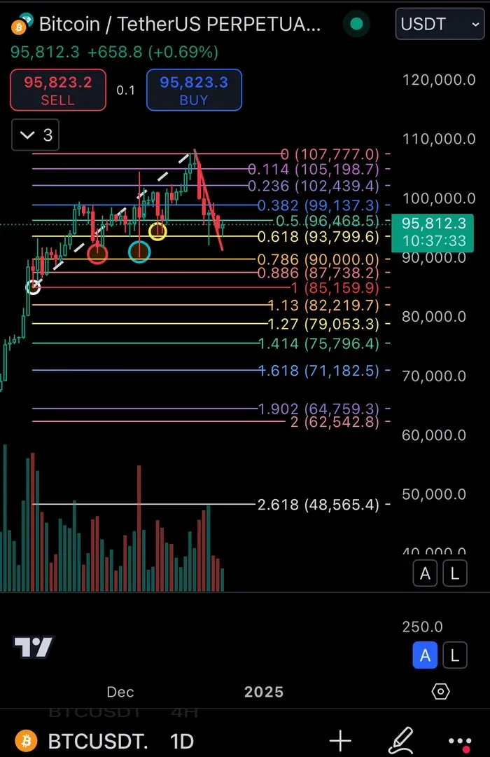 횡보 또는 상승 중 변동성이 클 때피보나치 왼쪽 저점을 어디로 해야할까요? 저는 4 저점 중 우선은 거래량이 많은 첫번째 흰색과 세번째 초록 부근에서 찍어봤습니다