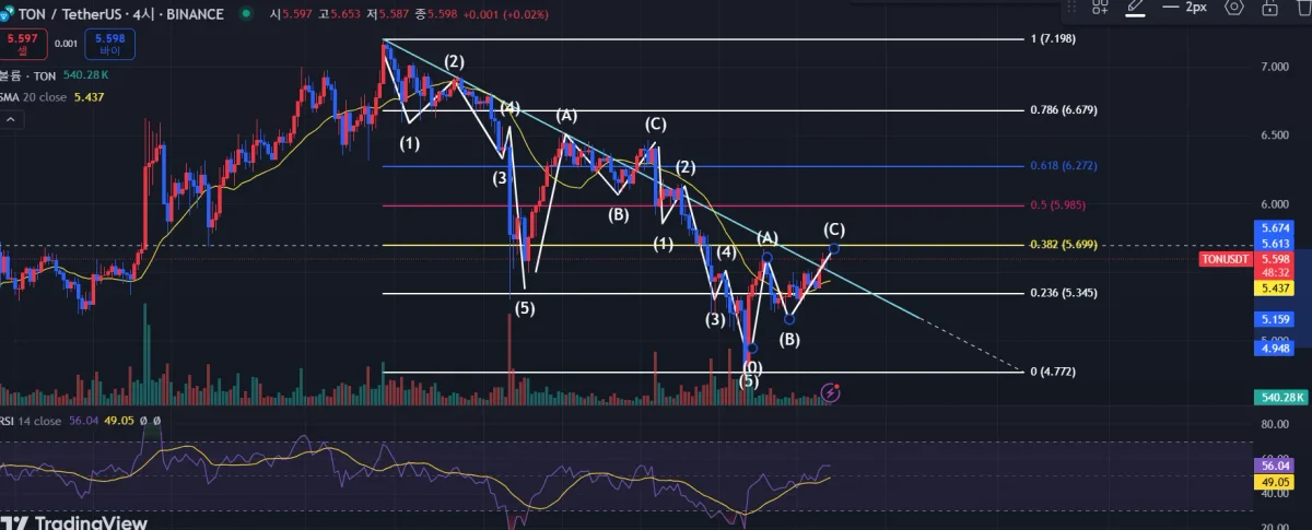 하늘색 하락 추세선과 피보나치 되돌림 + 엘리어트 파동도 정확할지는 모르겠지만 그려보았습니다.