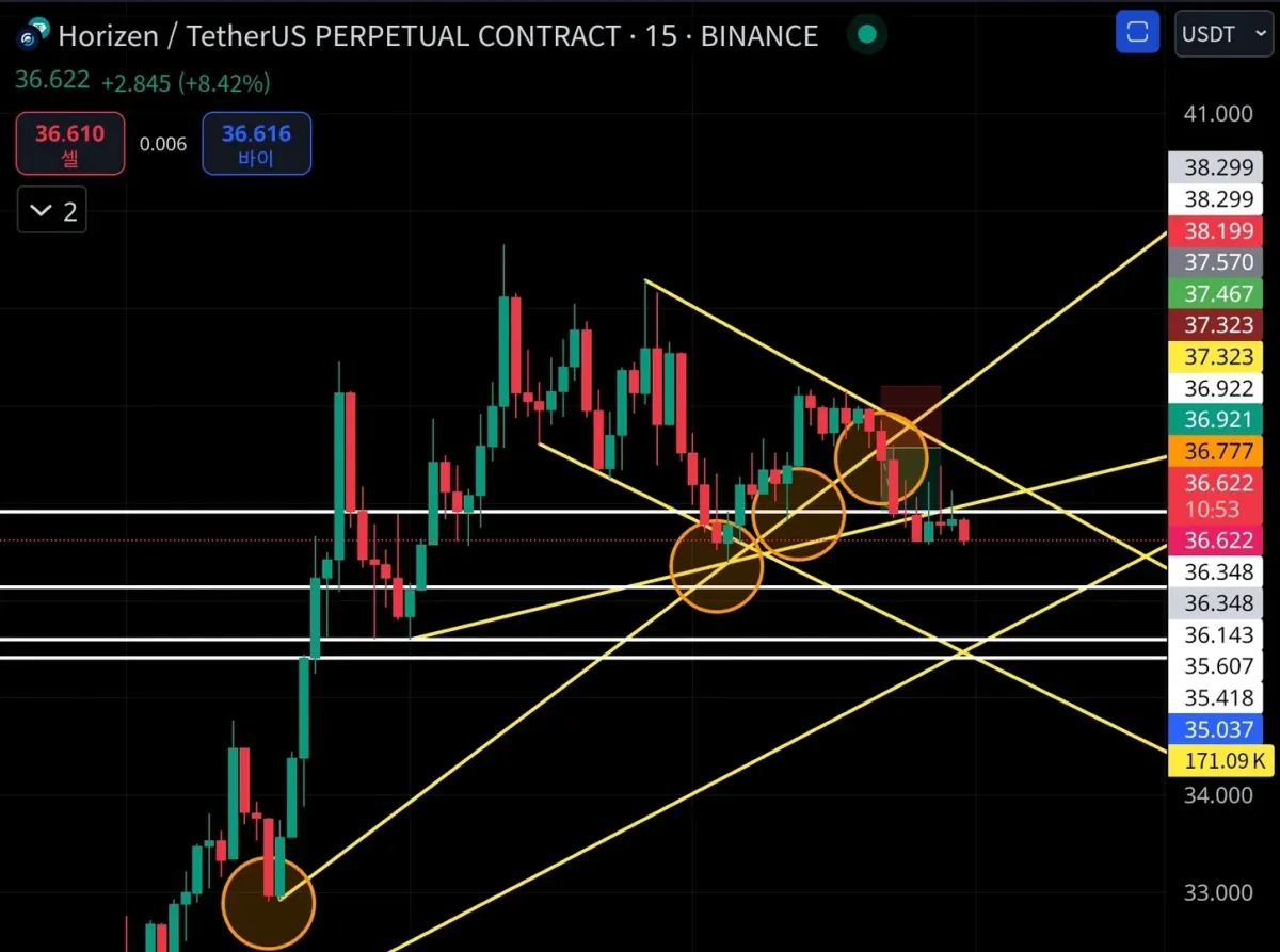 추세선 4회 터치 후 하방으로 이탈 확인되어 매수 진입하였습니다.