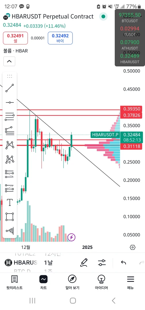 저는 이번엔 알트 헤데라를 추세선과 매물대 확인하면서
