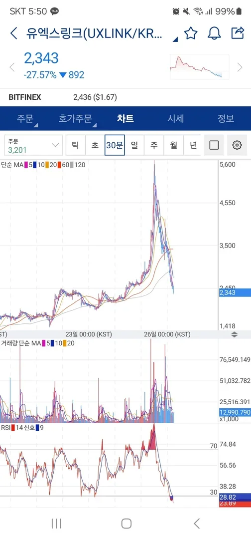 전일 대비 거의 30프로정도 빠져있고 rsi 지표에도 수치상 30이하로 떨어져 매도세가 강해보였습니다.