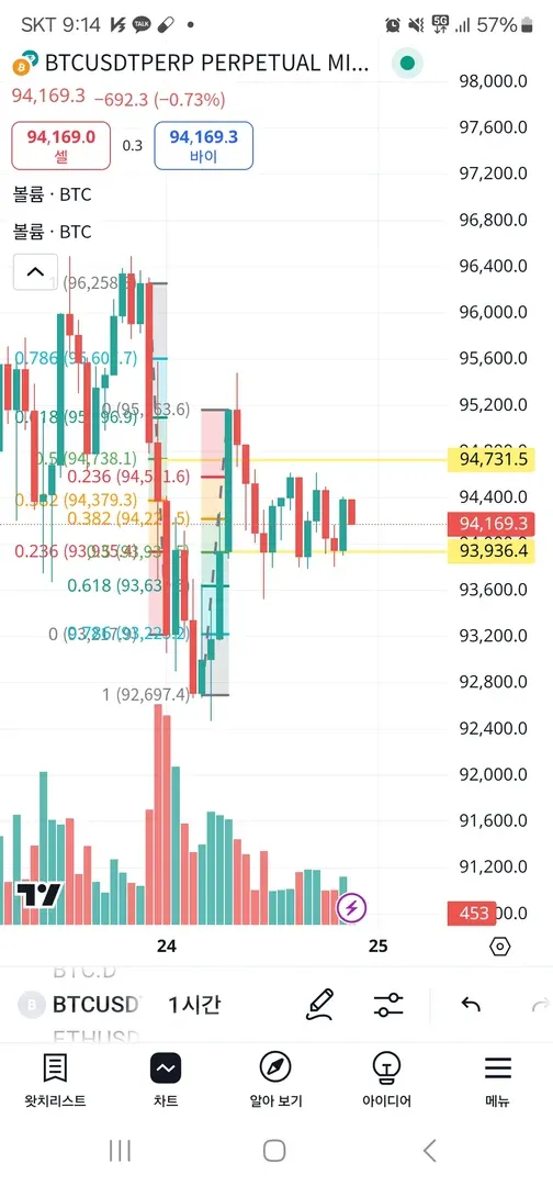 뭉텅이캔들 실전특강을보고 하락구간 피보나치 0.5인 94731 애서 숏 진입 상승구간피보나치 0.5인 93936 에서 롱 진입 예약해놓고 잠이들엇고...스탑로스를 못걸었어요 . .