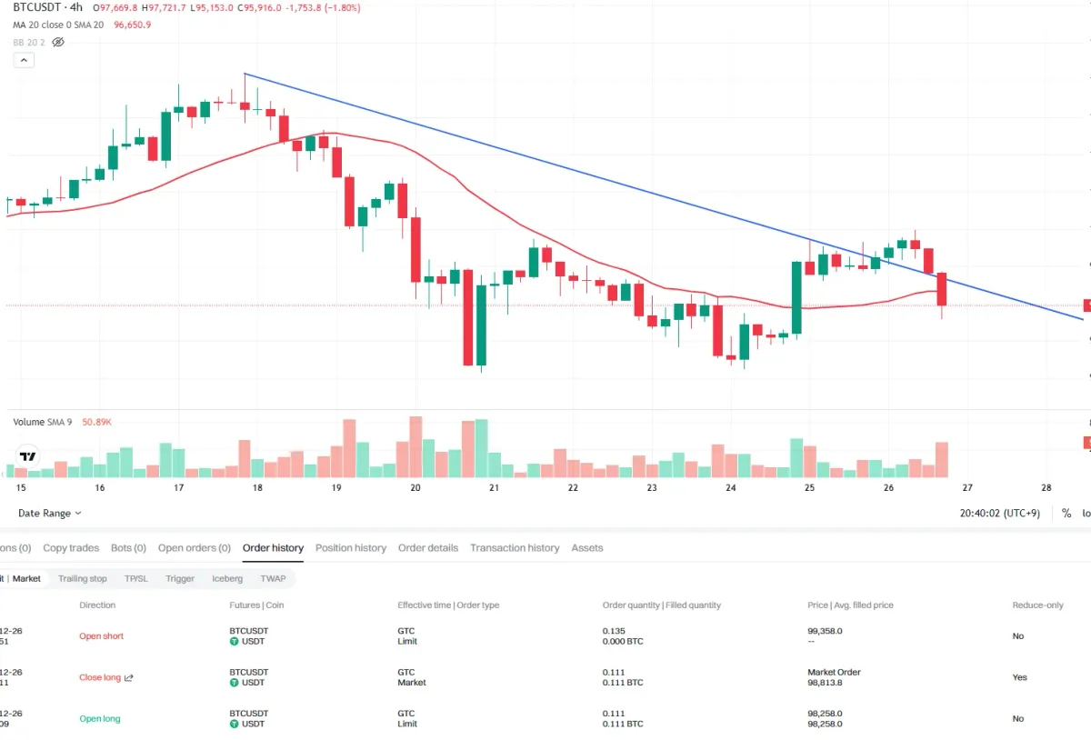 4시간 20이평선 위 지지 받고 반등 하는 모습을 보고 long position 진입후 100k 구간에서 익절 마무리 하였습니다.
