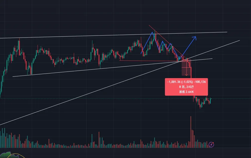 1. 그려놓은 추세선에 계속 지지를 받는 것 같다고 생각하여 테스트 후 올라갈 때 진입