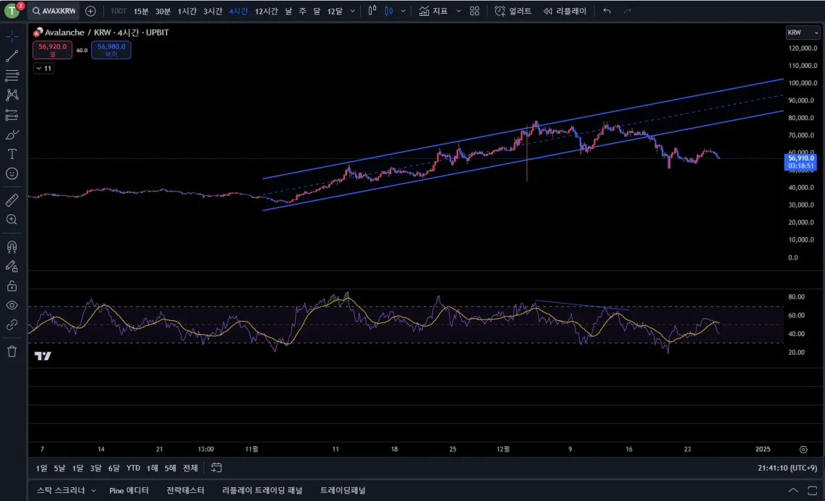 상승 채널을 잘 타고 오다가 rsi가 하락 다이버전스