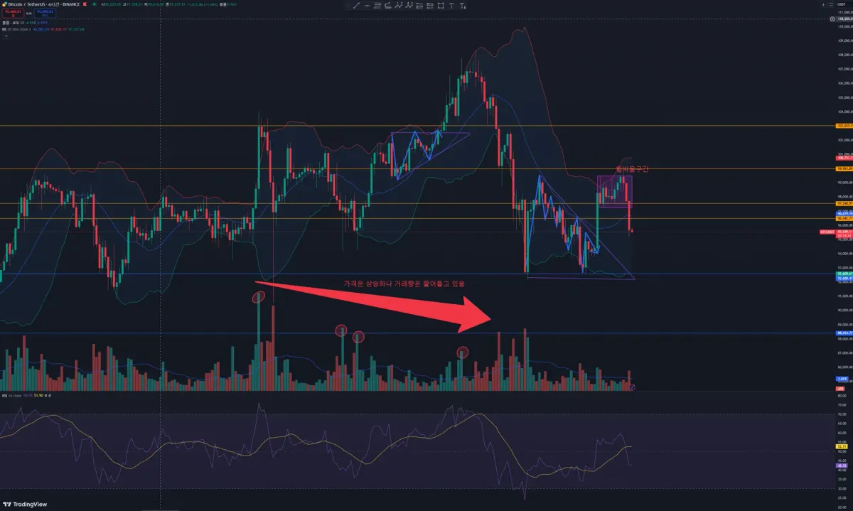 비트코인 4시간 봉 입니다. 급 하락 직전 거래량이 점진적으로 하락한 모양을 발견할 수 있었습니다.