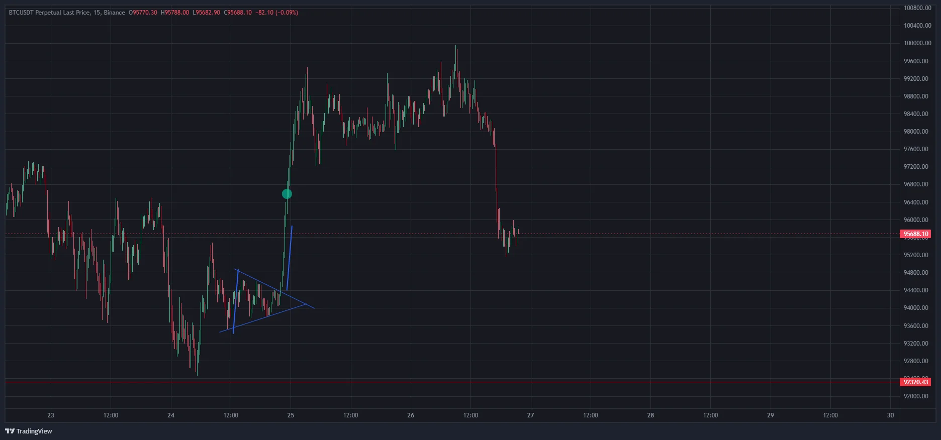 진입 이유 는 삼각수렴 패턴 완성후 입구 크기만큼 상승 후 삼각형 꼭지점까지 다시 회귀한다는 패턴 특성을 생각하여 위에서 숏을 진입하였으나 되돌림 없이 계속 상승하는 모습을 보고 손절하였음