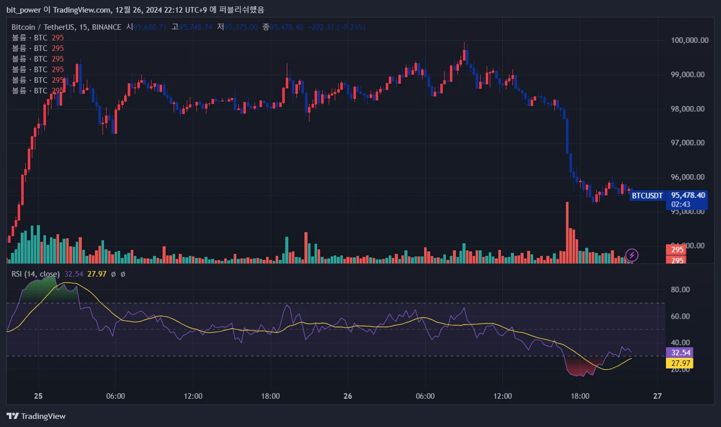 비트코인 15분봉 차트입니다. RSI 지료를 추가 했으며, 현재 RSI 30이하로 상승하려는 움직임을 보이고 있는 것 같습니다.