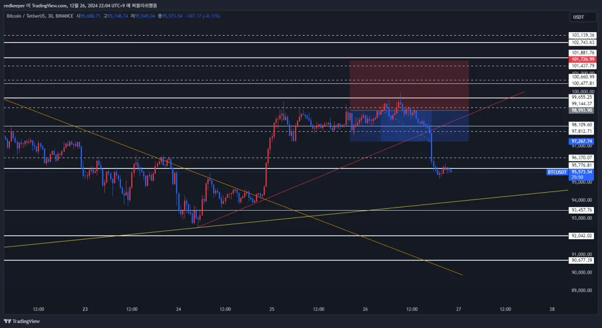 2. 1시간봉 기준 98,993에서 저항을 받고 있는 것을 확인