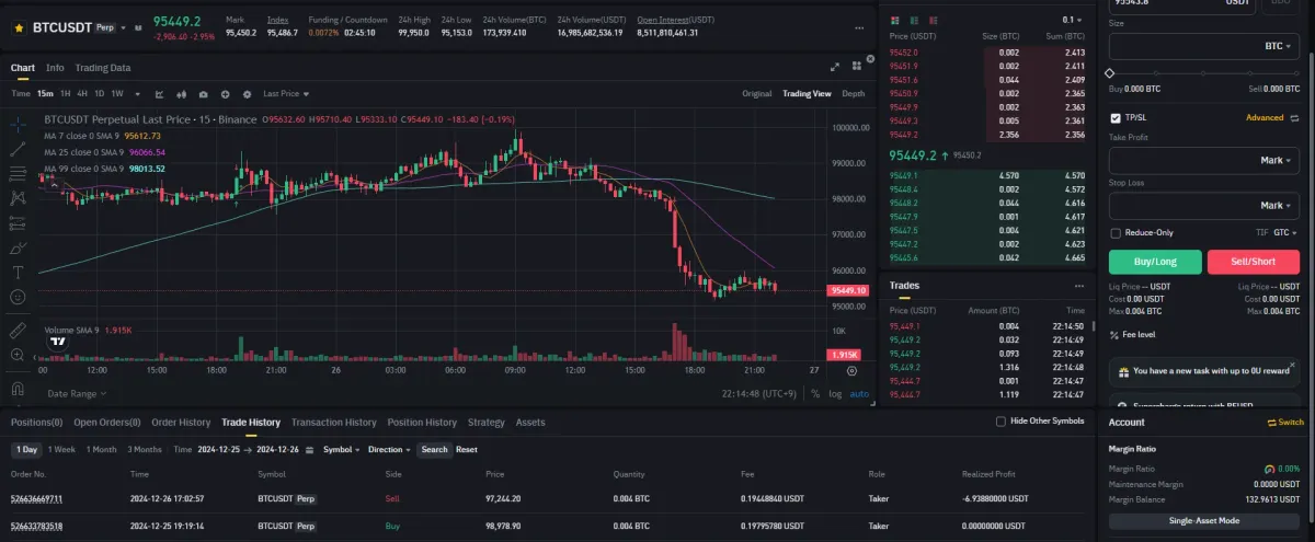 4. 손절 라인은 1시간 봉 저항선인 97,812.71 보다 조금 아래인 97,267.74로 잡음