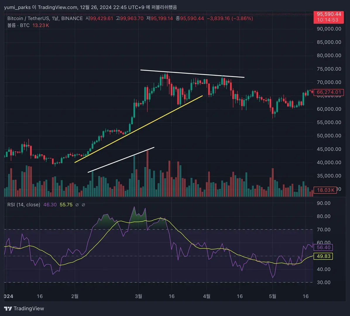 상승추세와 더불어 RSI 와 거래량 모두 상승 중이기 때문에 조정이 올 것 이라고 유추해 볼 수 있습니다