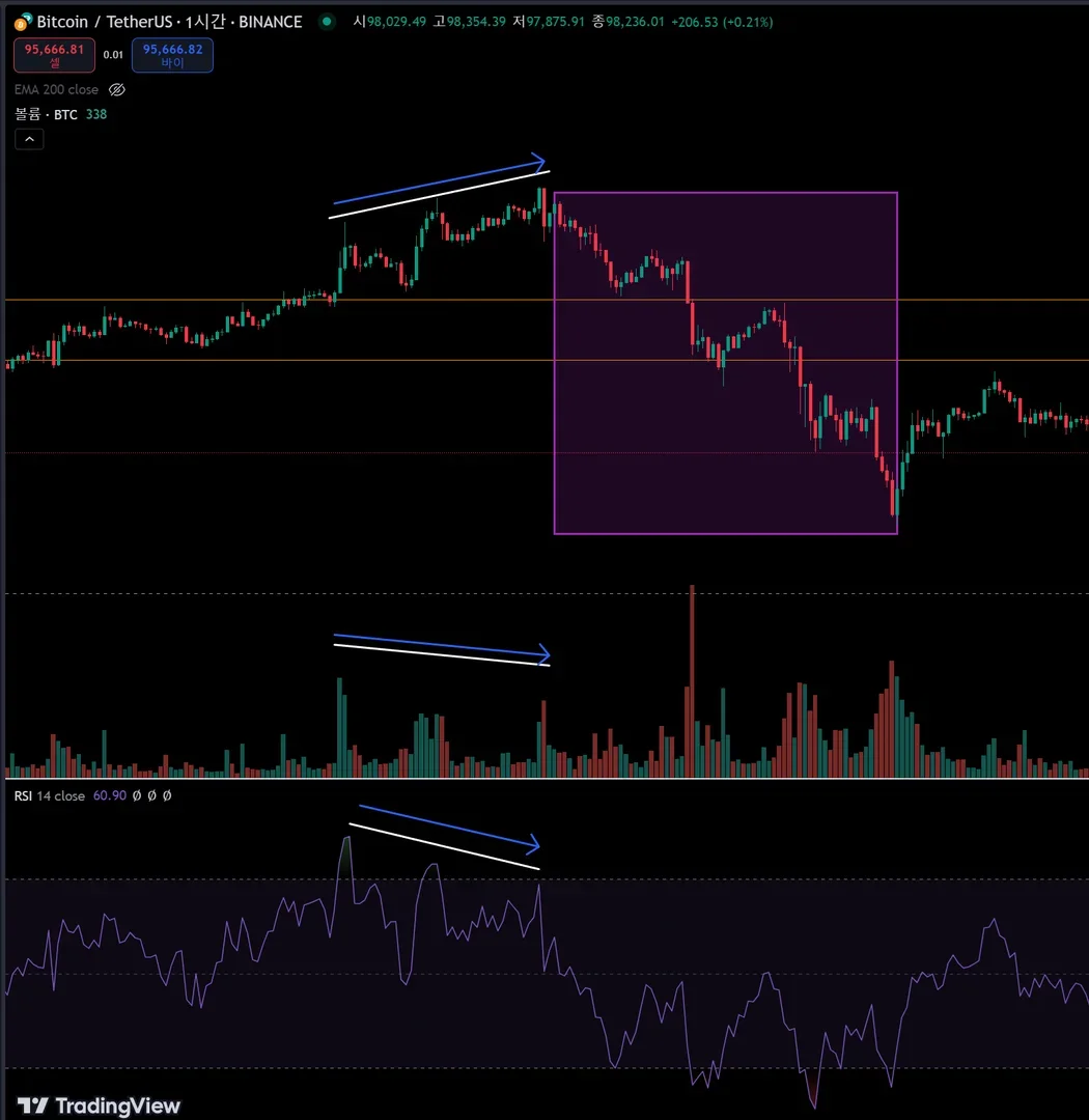 주가의 고점은 점점 높아지지만 RSI의 고점은 점점 낮아지며, 거래량도 줄어들면서 강한 하락추세로 반전되었습니다.