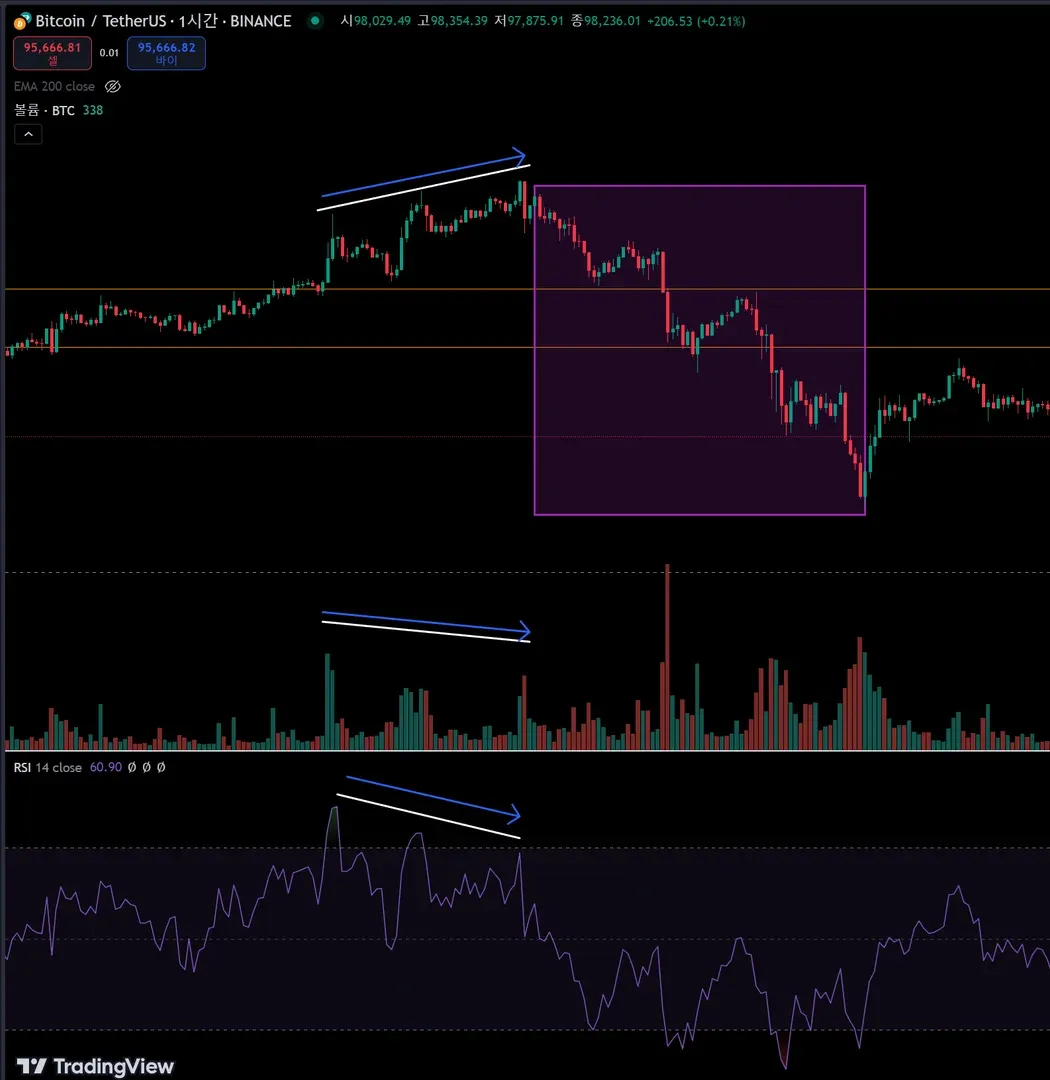 주가의 고점은 점점 높아지지만 RSI의 고점은 점점 낮아지며, 거래량도 줄어들면서 강한 하락추세로 반전되었습니다.