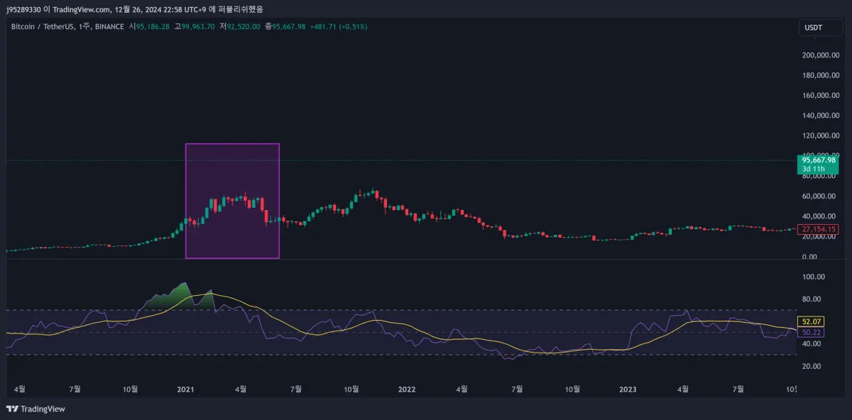 위 이미지는 비트코인차트이고 rsi의 저점은 계속해서 감소하는데 가격은 올라가고있다. 따라서 상승 다이버전스가 발생해 추세가 바뀌어 큰 조정이 왔다