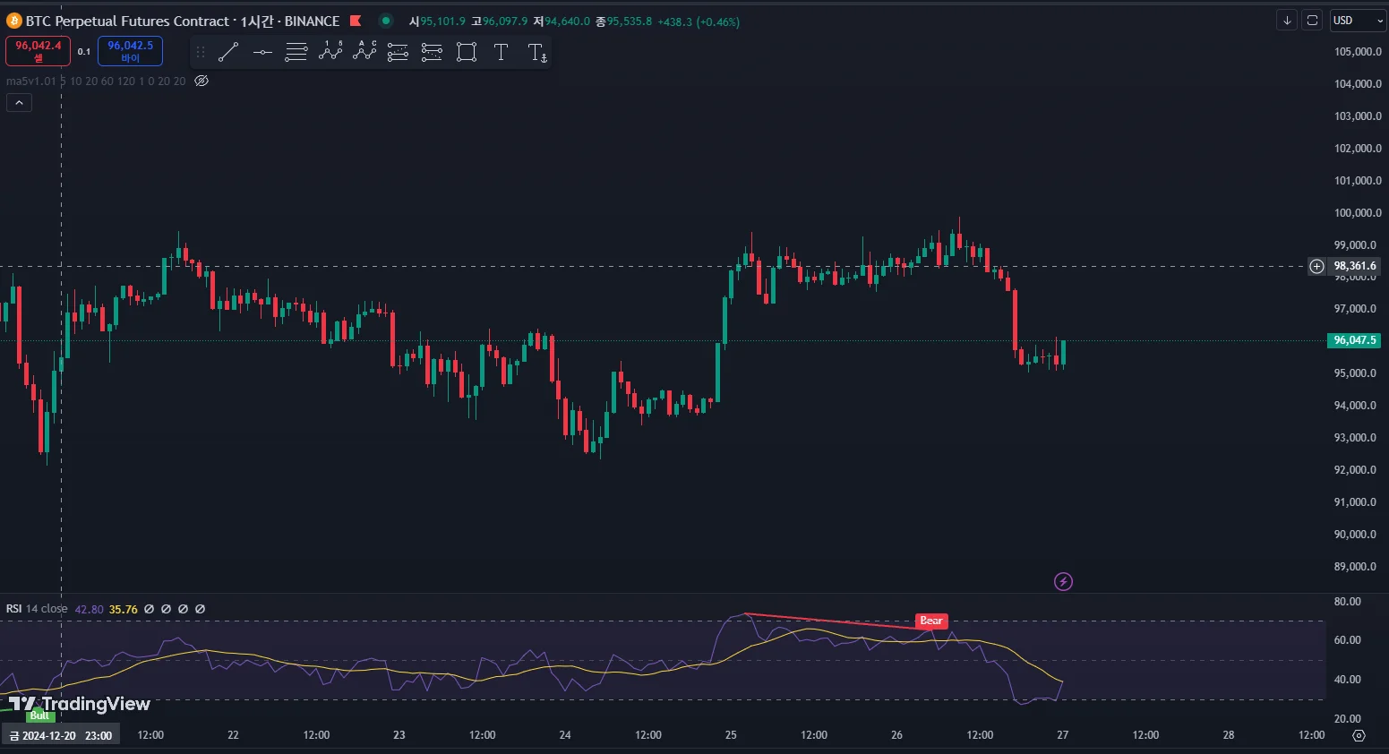 비트코인 1시간봉 차트입니다. 과매수 70이 넘어가고 조정이 보이는듯한 모습이네요