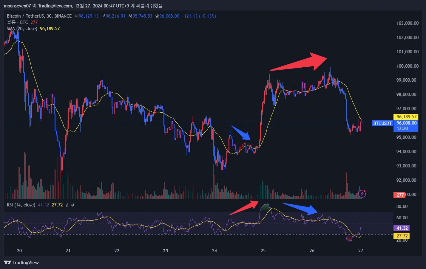 주가가 상승 하면서 RSI는 하락곡선을 그리고 추세가 꺽이면서 주가는 급락하였습니다.