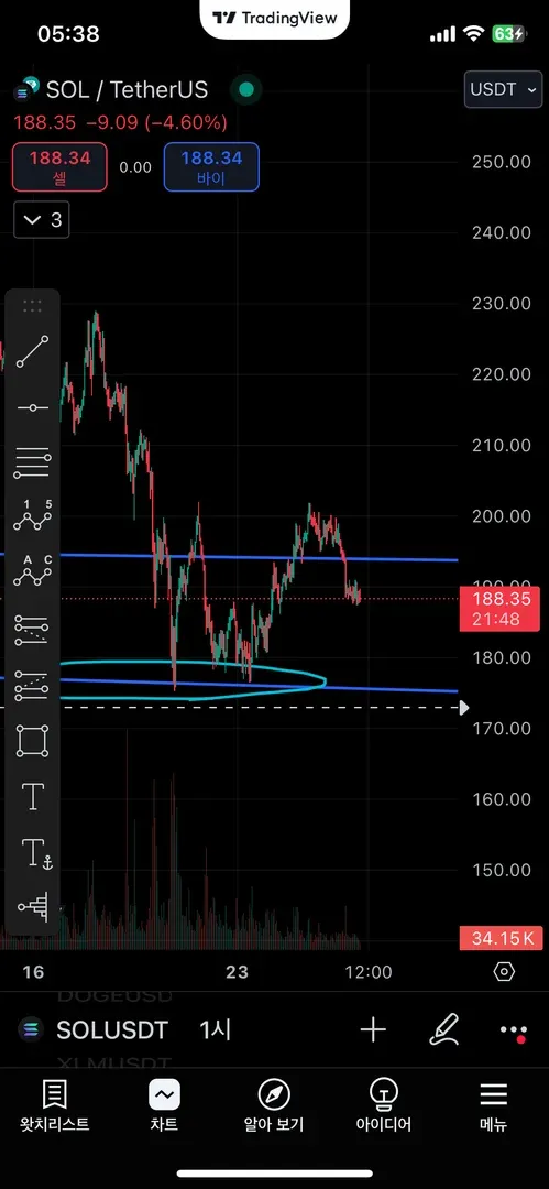 아래 동그라미와 선은 저번에 그었던 매물대 기반 추세선입니다 약 175달러에 진입, 현재는 현물이라 3.5%정도 수익자리이고 원하는 자리가 안와서 홀딩중입니다 다만 아래 추세선을 이탈하면 손절하고 다음 자리를 기다릴 생각입니다