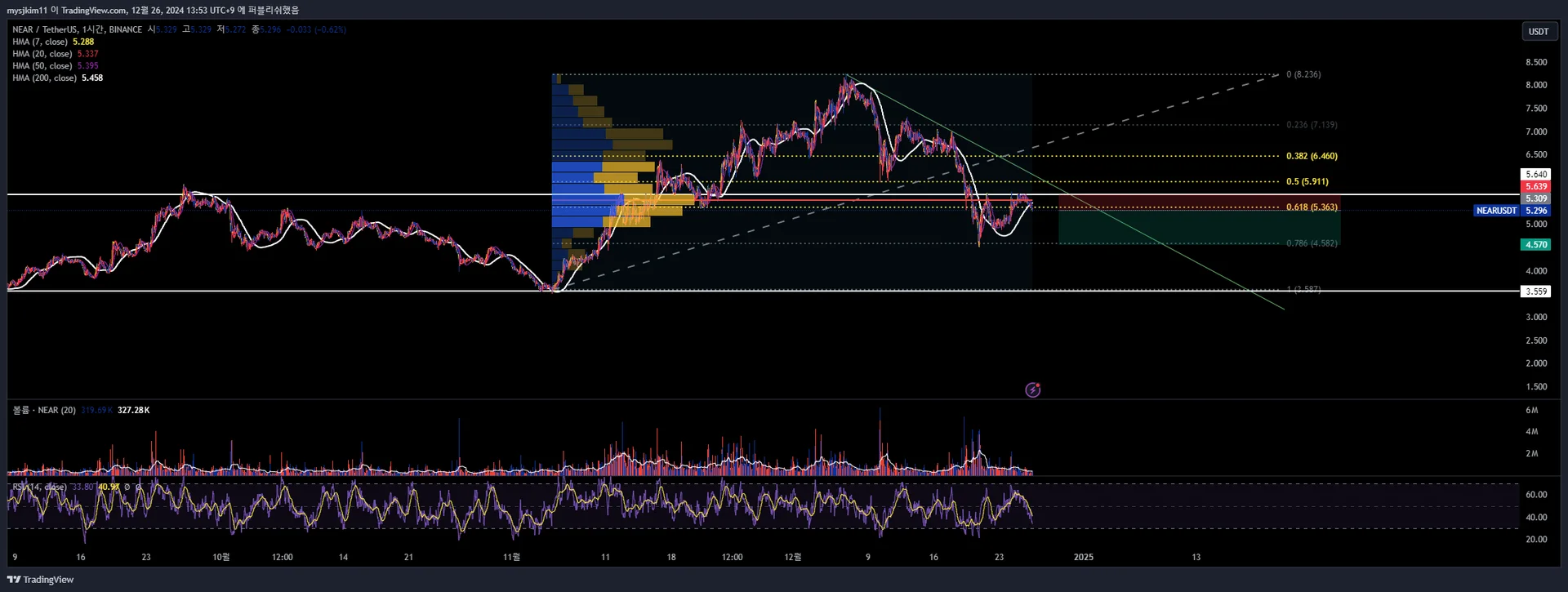 현재 하락 추세가 지속 중이며, 가격은 피보나치 0.618 아래에 있고 주요 매물대 하단에 위치해 있습니다.