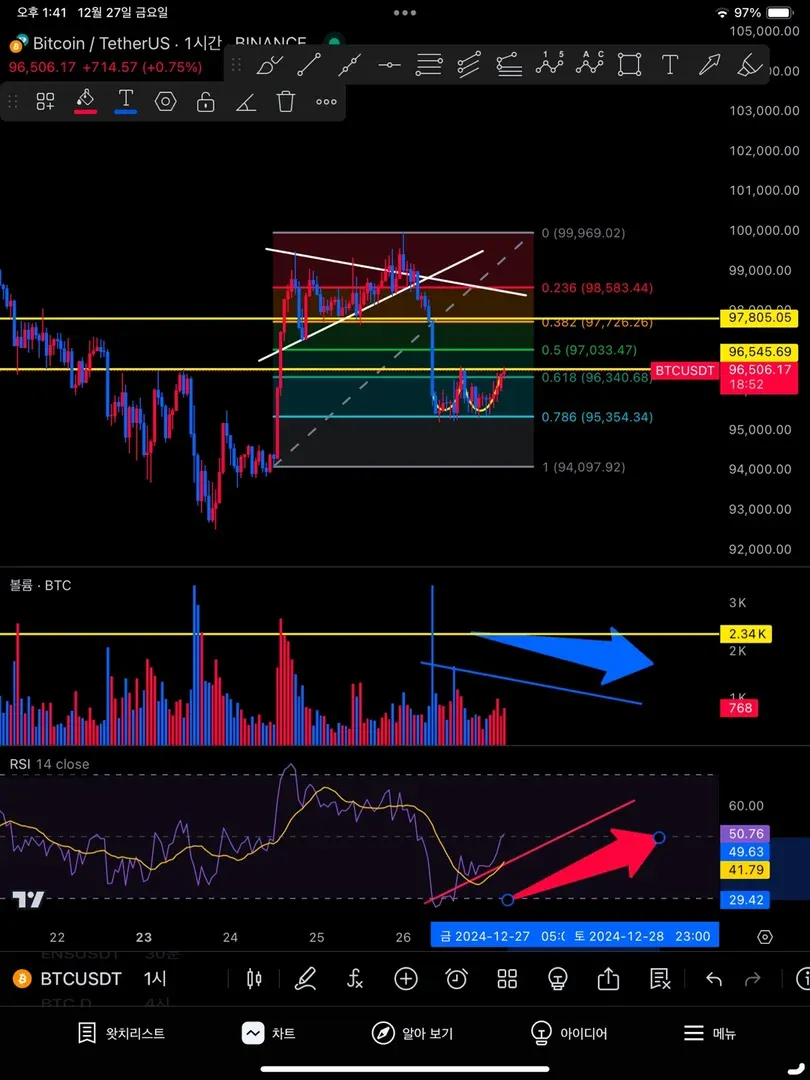 가격은 상승하고 있지 않고 RSI는 상승하는데 거래량은 하락하는 것으로 보이고 있습니다.