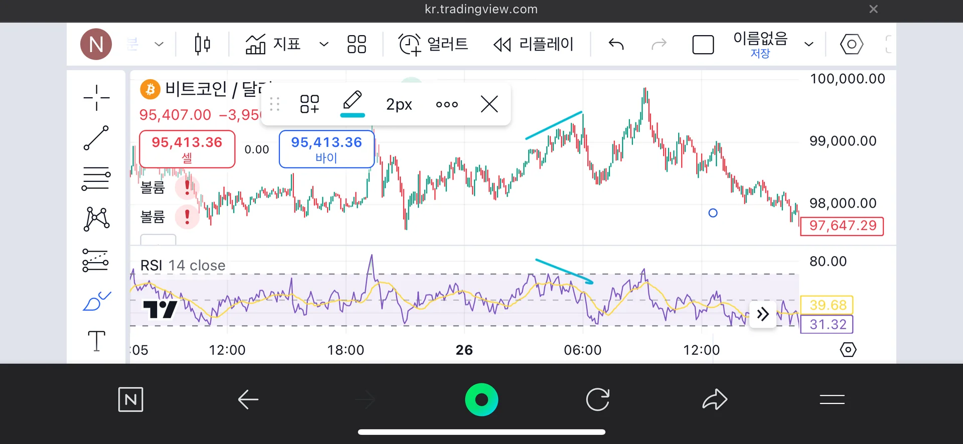 Rsi 추가했습니다. 추가하고 한번 다이버전스를 찾아보았는데요