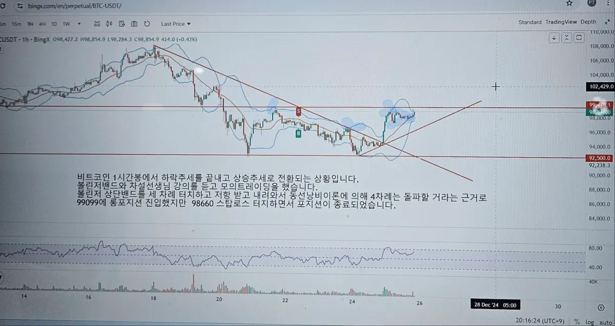 볼린저 밴드 상단에서는 과매수 상황이라서 short 포지션 진입이 기본 개념인데 강의 내용을 제대로 파악하지 못하고 진입해서 손절가에서 포지션이 종료되었습니다.