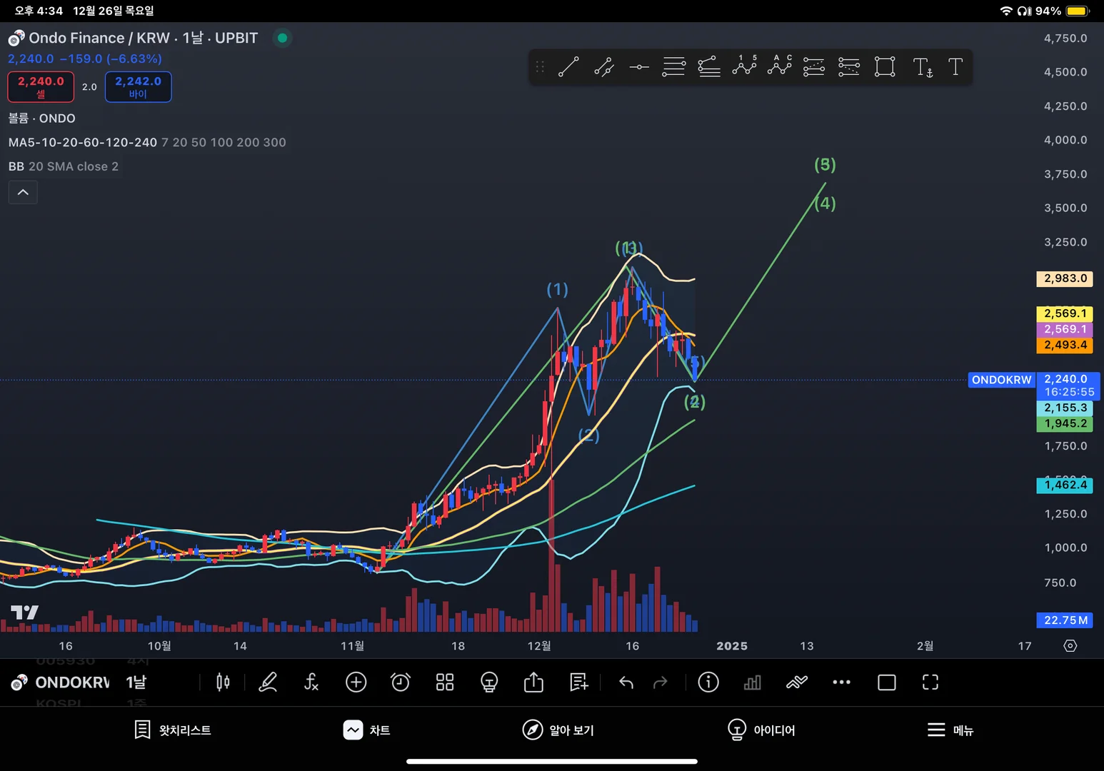 온도 일봉 엘리엇 충격파의 5파 or 3파초입 예상 매수진입 횡보중