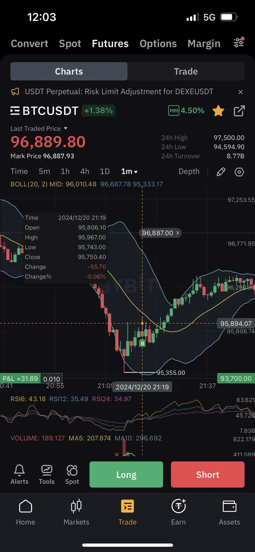 1분봉과 5분봉만을 기준으로 매매했기 때문에 신뢰성은 1시간 4시간 기준보다는 떨어진다고 판단 하였고 비중을 많이 낮춰서 진입하였습니다 손절가는 95000 목표가는 97500이었기 때문에 손익비가 좋다고 판단 손절가는 1분봉 저가 95300부근인데 저배기때문에 좀 더 루즈하게 잡앗고 목표가는 1시간봉이97500부근에서 저항대가 있어서 목표가를 설정하였습니다 결과론적으로 매매는 성공적이었습니다다비중을 줄이고 들어가니 조급함도 없고 편안하게 손절가 목표가를 잡아둔뒤에 휴식을 취했습니다