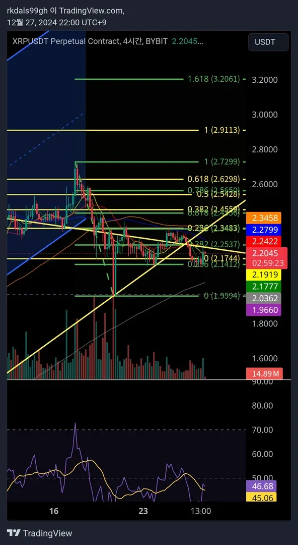 리플 4시간 차트입니다. 고점과 저점의 피보나치를 작도하였을 때, 0.238 구간인 2.1412구간에서 롱 포지션을 잡고 손절가 1.9594 익절가 2.2537로 두고 매매했습니다. 현재 한번 2.2537에서 매도 후 다시 2.14에서 매수하여 수익중입니다.
