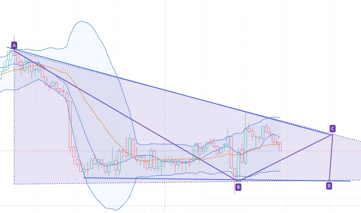 작성자비트코인 30분봉에서 추세선을 그어 보았는데 생각보다 추세선이 보이지 않아 삼각수렴 형태로 흘러 가고 있는게 아닌가 싶어 세모패턴을 적용해 보았습니다. A가 고점이고 B가 현재까지 저점이고.. B에서 상당히 여러 번 지지를 해 주었습니다. 아마도 B 부분이 깨지면 추후 저항으로 작용하지 않을까 싶습니다.