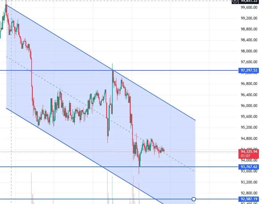 15분 차트를 보면 하락추세를 보이고 있고 하락시 이전 하락때 반등해준 $93,800라인 지지를 받고 반등하여 하락패러렐 채널 중단부분에서 횡보 중