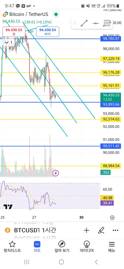 다음 매매는 하락채널 하단선 노란색 지지선 하락다이버전스 복합 확인후 매매 롱진입 예정입니다