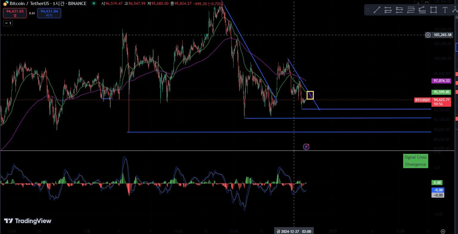 2차 지지 라인인 92.2까지만 뚫리지 않는다면 116k에 이르는 임펄스 5파가 나올것으로 예상을 하고있습니다.