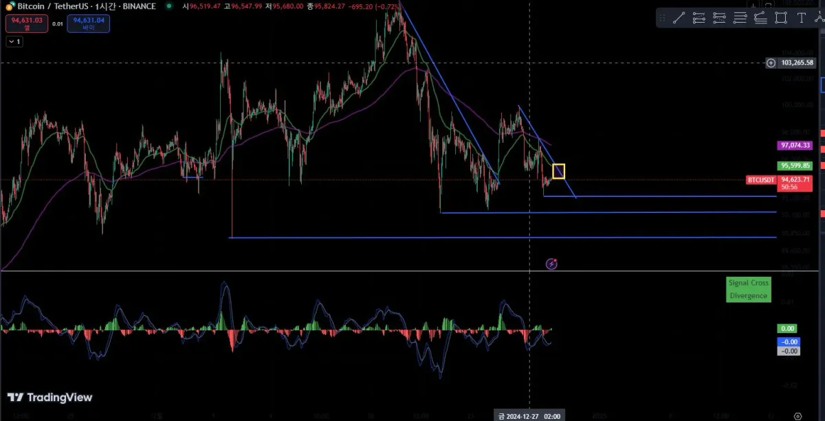 2차 지지 라인인 92.2까지만 뚫리지 않는다면 116k에 이르는 임펄스 5파가 나올것으로 예상을 하고있습니다.