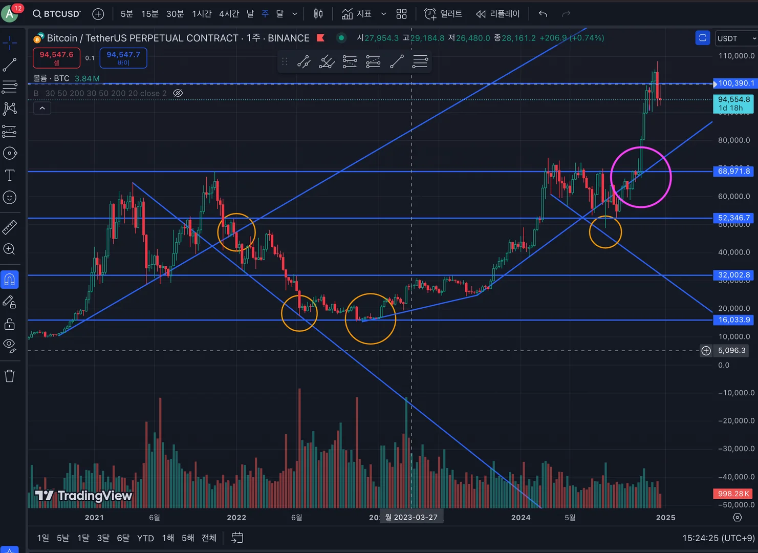 주봉입니다. 월 봉과 같은 구간 중 분홍원으로 표시된 구간에서 마찬가지로 추세선과 지지저항선 부근 시세분출 확인하였습니다.