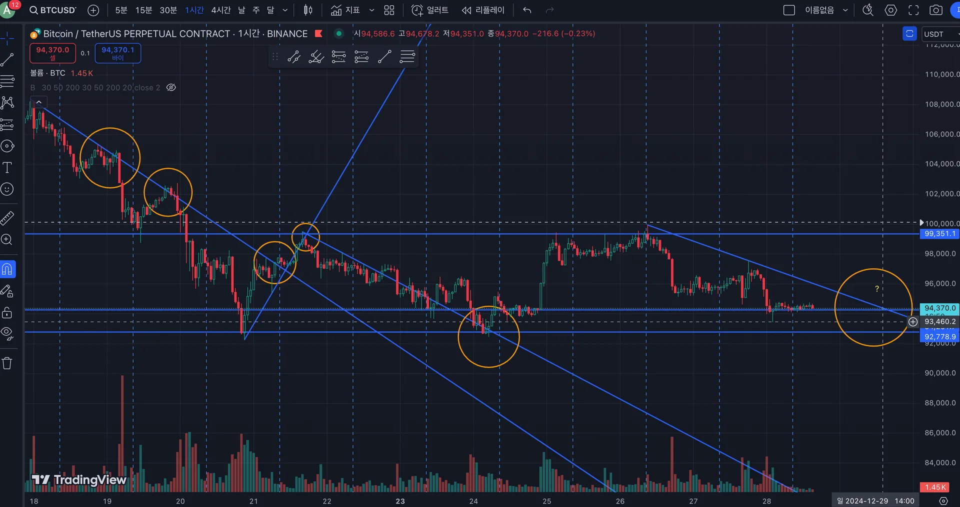 현재 가격대인 94000 부근 시세를 지켜준다면, 내일 (29일) 12 - 16시 사이 시세분출을 기대할 수 있겠습니다.