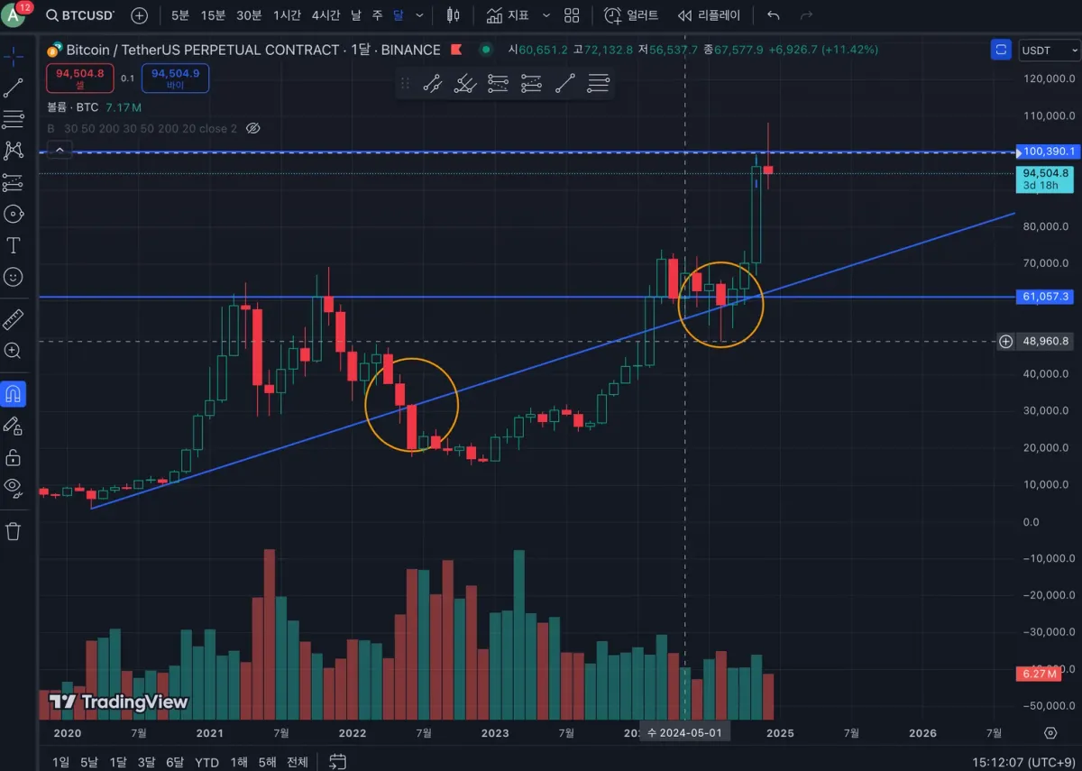 달 봉 입니다. 첫번째 원 에서 상승 추세선 이탈하였으나, 추세선을 시작한 20년 7월 부근 저점을 갱신하지는 못했습니다.