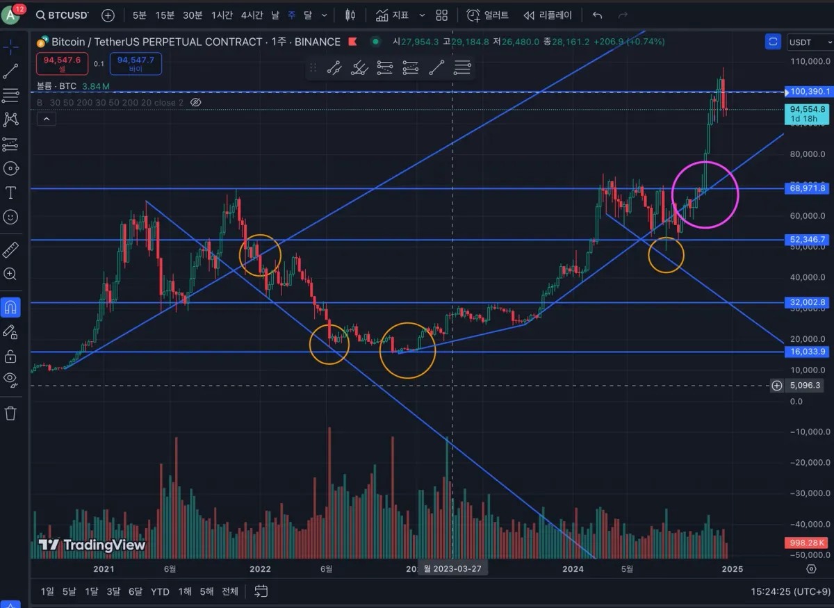 두번째 원에서는 추세선과 지지 저항선이 마주하는 타이밍에 시세 분출이 있었음을 볼 수 있습니다.
