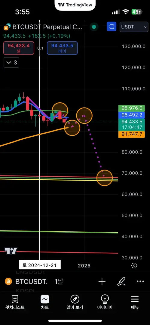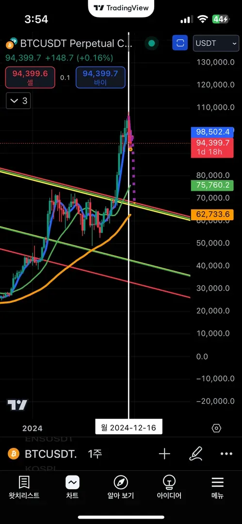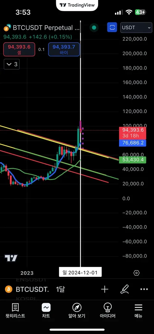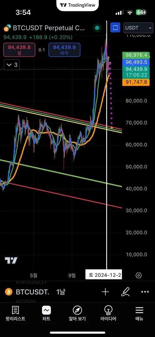 저는 월/주/일로 나눠서 지지, 저항선을 만들어 보았습니다. 우선 월(빨강), 주(노랑), 일(초록)으로 나누어 그려보았고, 각각의 선은 역대 전고점과 수직상승을 통해 추세가 상승으로 전환되었던 가장 밑의 빨간선을 기준선으로 잡고 큰 상승이 이루어지는 구간의 제일 밑 기둥에 선을 그어 봤습니다.(월, 주, 일)