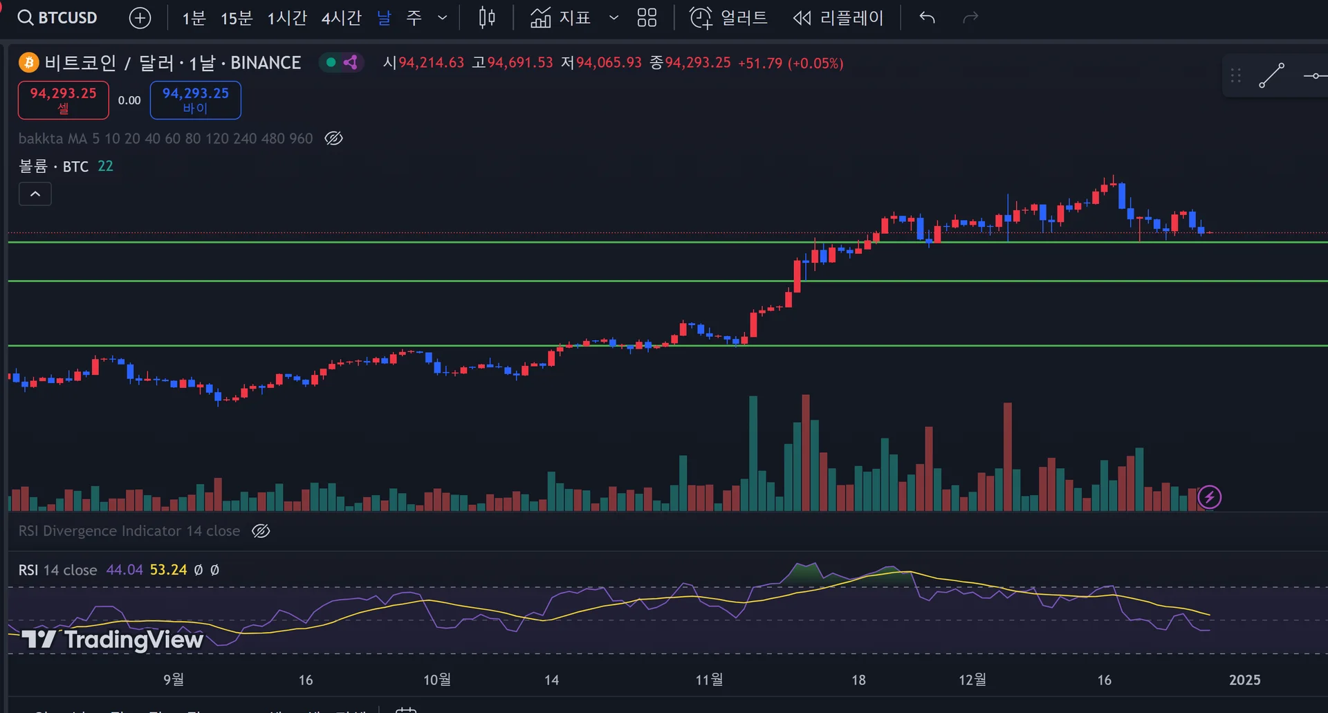 30일 챌린지 7기 2주차] RSI지표 및 거래량 터진 구간 수평선 작도