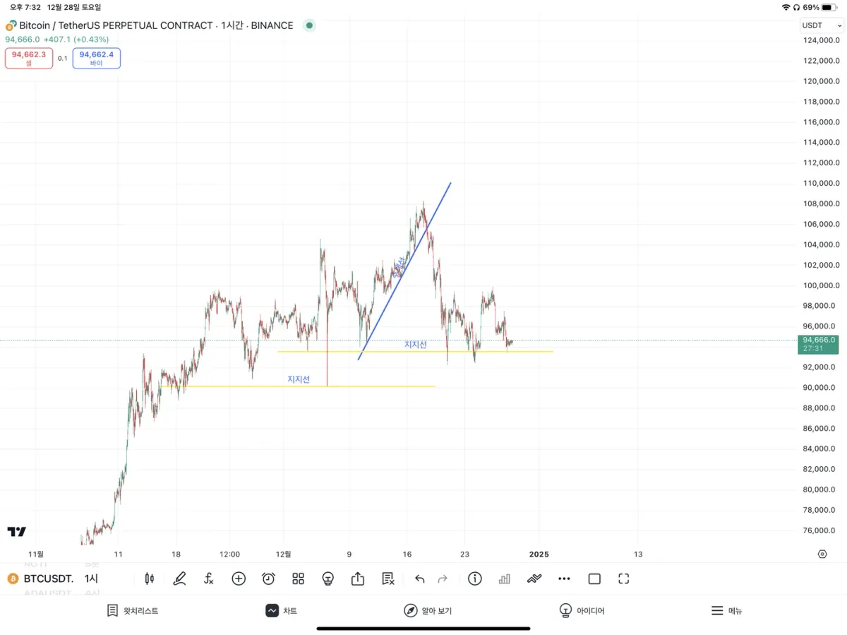저점이 높아 지는 부분을 이어 상승 추세선을 그렸고, 급락한 긴꼬리 발생지점에서 지지선과 상승추세선이 발생하기 시작한 것으로 보이는 지점에서도 지지선을 그려보았습니다. 익숙하지 않아서 찾는것이 너무 어렵습니다 ㅠㅠ 맞는지도 아리송하네요 ㅠㅠ