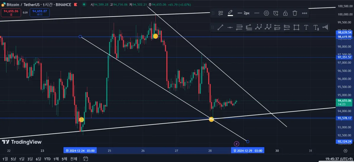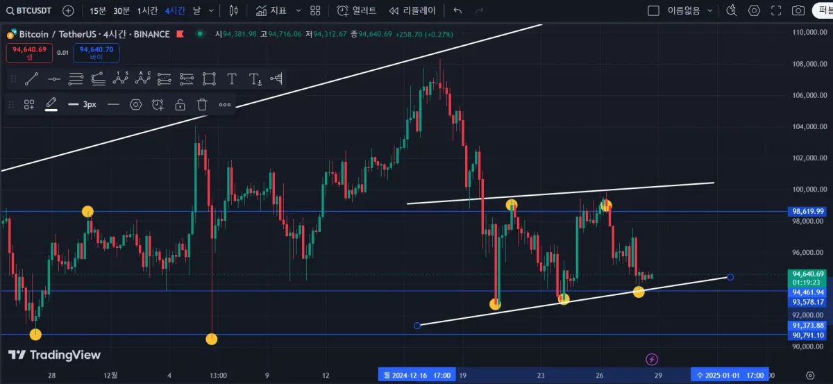 고점과 저점이 낮아지며 하락추세로 보입니다.