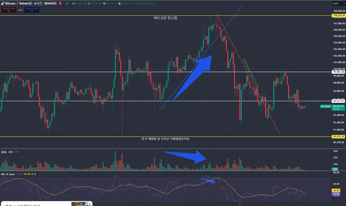 화살표를 그려놓은이유는 가격상승하나 거래량이 줄어드니 결국 하락. 하락전 최고점 근처에서 RSI 가줄어듬으로 하락다이버전스?발생후 하락 이렇게 분석해봤어요.