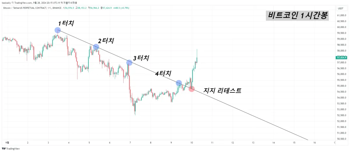 특강 중 보내주신 자료 중 3터치 부분은 완전 터치는 아니고, 같은 맥락으로 4터치도 약간의 추세선 넘김..? 의 모습이 보여서.