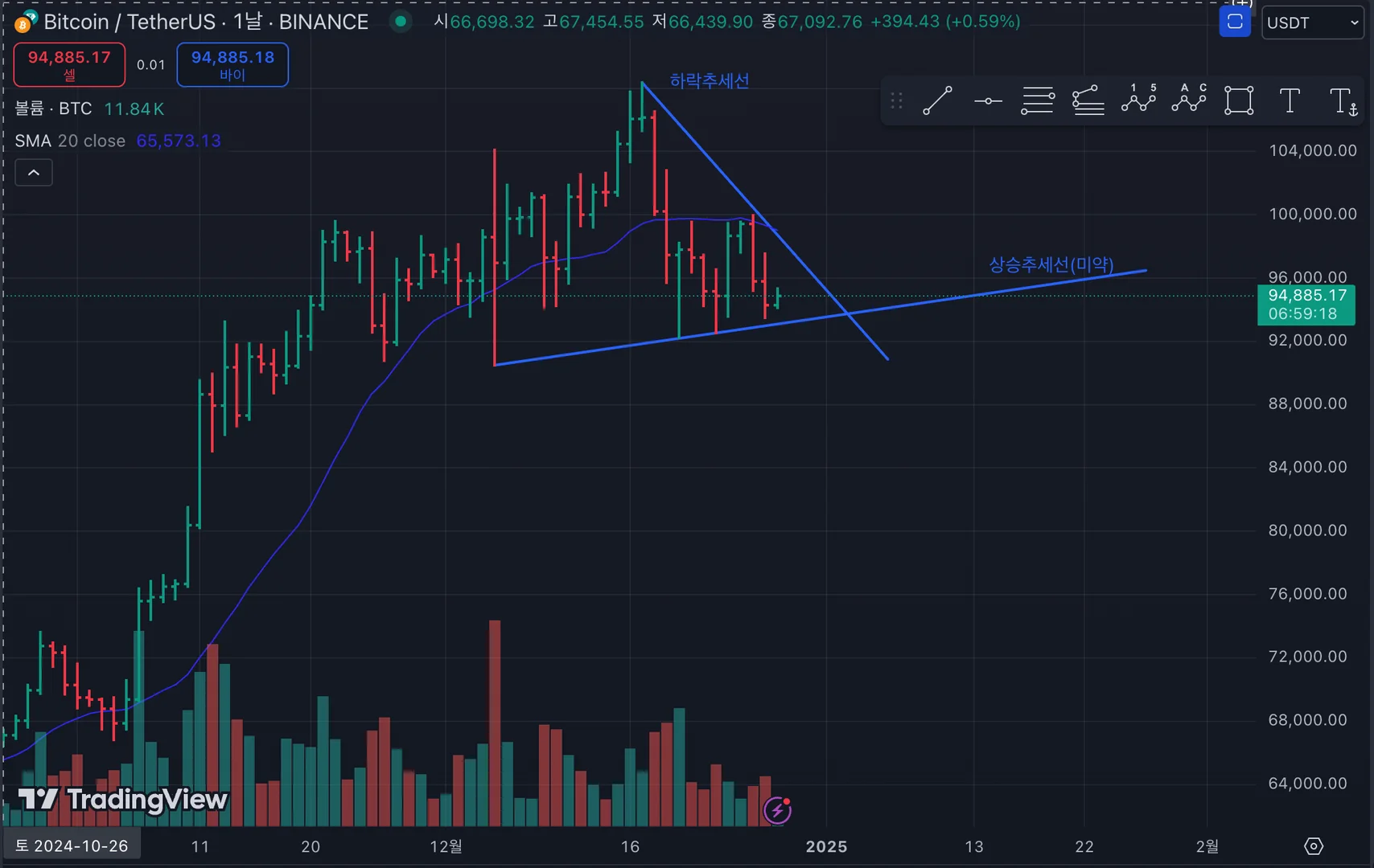 단기적인 하락 추세가 보이지만, 아직 그보다 장기적인 상승 추세선을 지지선으로 이탈하지 않고 있기 때문에 아직은 상승 추세라고 생각됩니다.