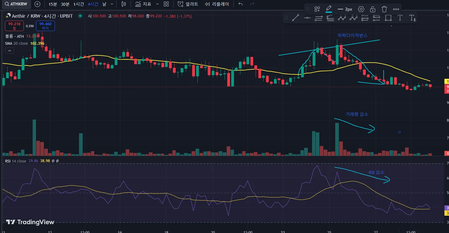 가격이 높아져 고점을 넘겼지만 RSI는 고점이 낮아졌고 하락다이버전스의 결과로 추세반전이 일어나며 가격이 하락한 것으로 보입니다.