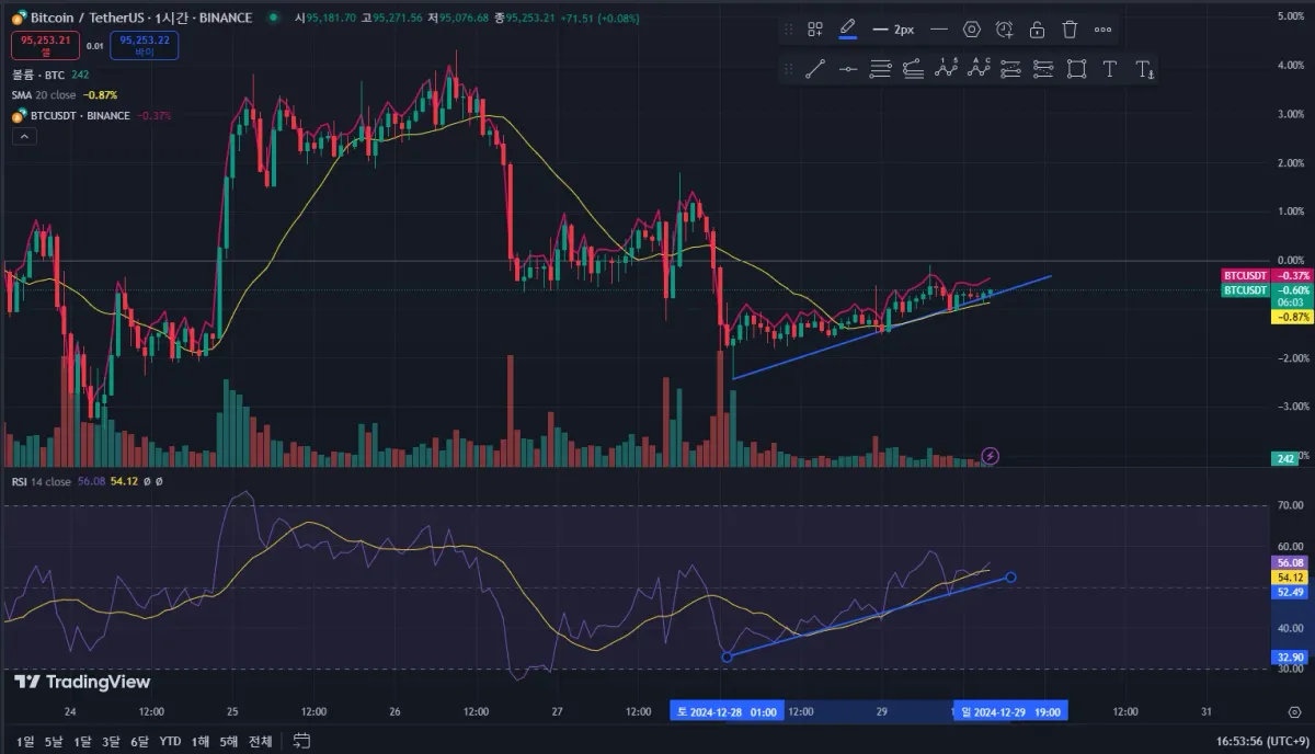 비트코인 바이낸스 1시간봉 기준으로 상승 바이전스로 해석해보았습니다